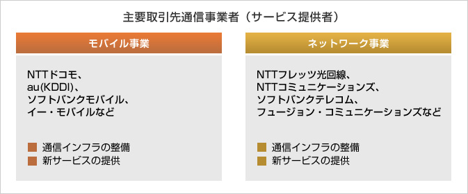 私たちは、信頼で勝ち得た国内の主要通信事業者様との良好な取引関係を築き上げています。